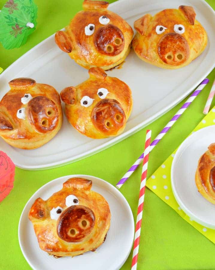 - 10 große Scheiben auf das Backblech setzen. Auf jede Scheibe mittig einen Esslöffel Füllung geben. Die Ränder mit Eigelb bestreichen, jeweils eine zweite große Scheibe darauf setzen und festdrücken. Die kleinen Scheiben als Schnauzen und die Dreiecke als Ohren mit Eigelb auf die Schweinchen-Gesichter kleben.